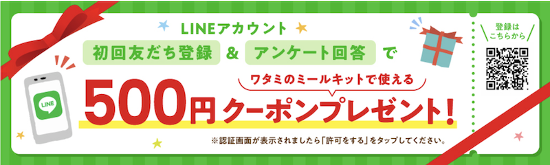 - 「選べるミールキット★ワタミ」のLINE公式アカウントに友だち登録してアンケートに答えると、3,000円割引クーポンとあなたやあなたのお子さまの誕生日月クーポンが発行される。